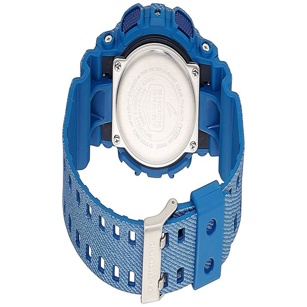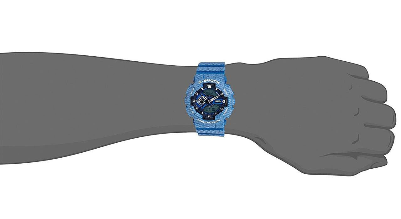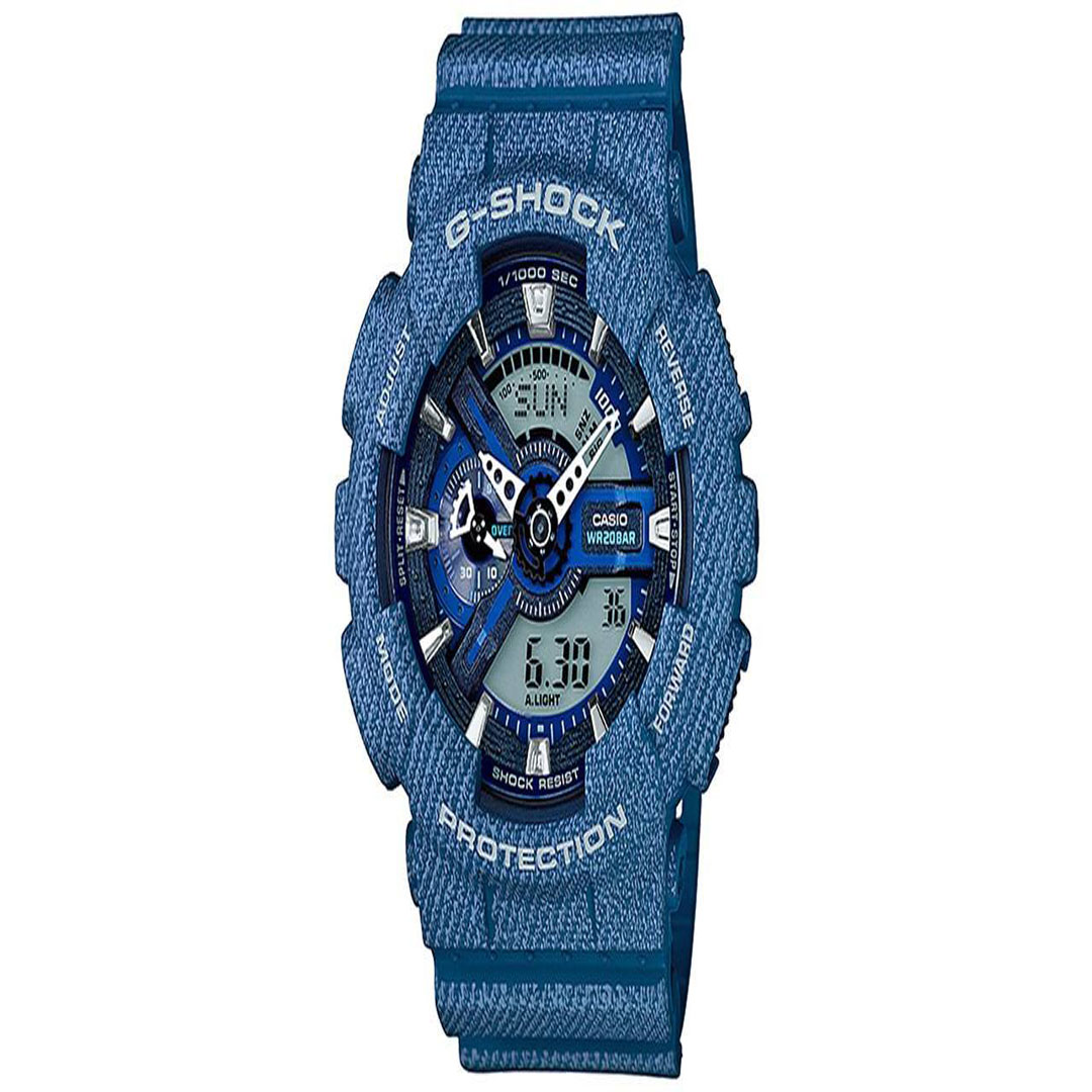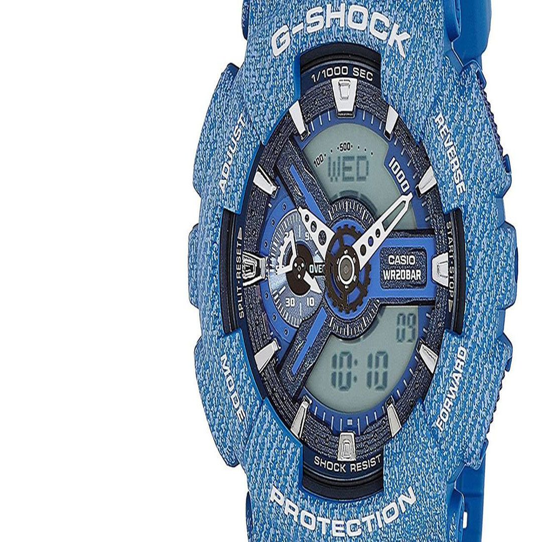 ساعت مچی عقربه ای مردانه برند کاسیو مدل GA-110DC-2ADR یکی از خاص ترین ساعت های این برند ژاپنی است که با طرح یا پترنی شبیه به پارچه ی جین (denim) طراحی شده است. این جی شاک جذاب و دوست داشتنی که در خانواده ی GA-110 دسته بندی می شود، علاوه بر عقربه های اصلی ساعت، از دو نمایشگر دیجیتال و یک نشانگر آنالوگ روی صفحه ی خود بهره می برد.